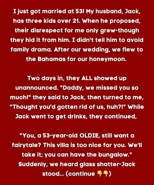 I never thought they would ruin my honeymoon, but one of them nearly made me collapse when they said, “You, 53-year-old hag! Still dreaming of a fairytale? This villa is too nice for you. We’ll take it, and you can have that tiny bungalow.”